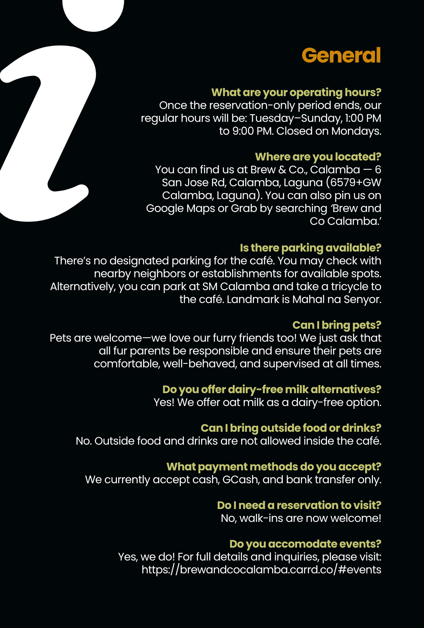 Open Tuesdays to Sundays, 10 AM to 10 PM.Follow us on Instagram (@brewandco.calamba) for the latest updates